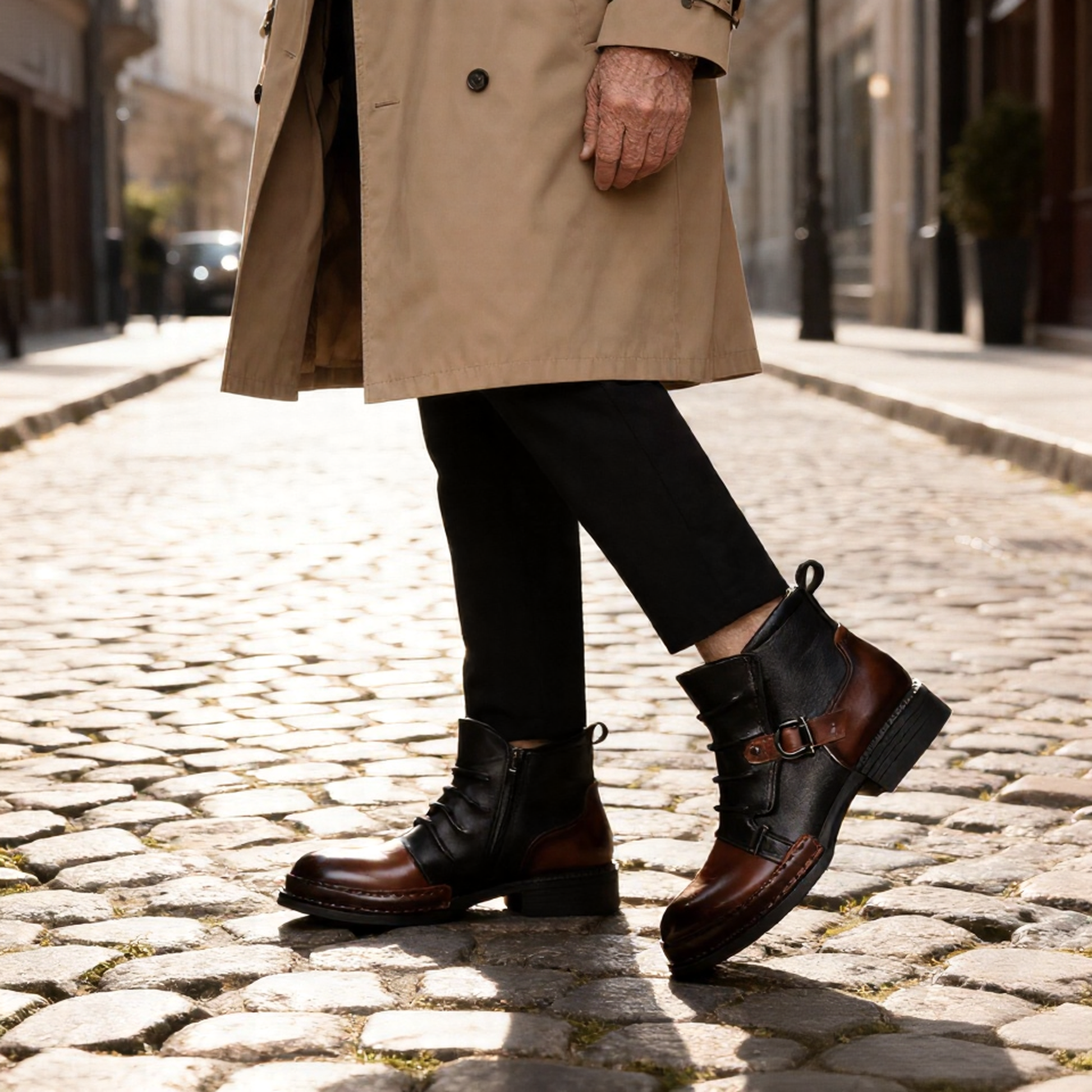 Denna hybrid-boot fungerar perfekt med allt – från klassiska mörkblå jeans för en casual look till väl skurna byxor och en blazer för något mer upphöjt. Folk märker dessa boots när du går in i ett rum. Det är något med kontrasten mellan färgerna, buckle-strapsen och det raffinerade ledararbetet som skapar en närvaro som säger "Jag vet vem jag är".