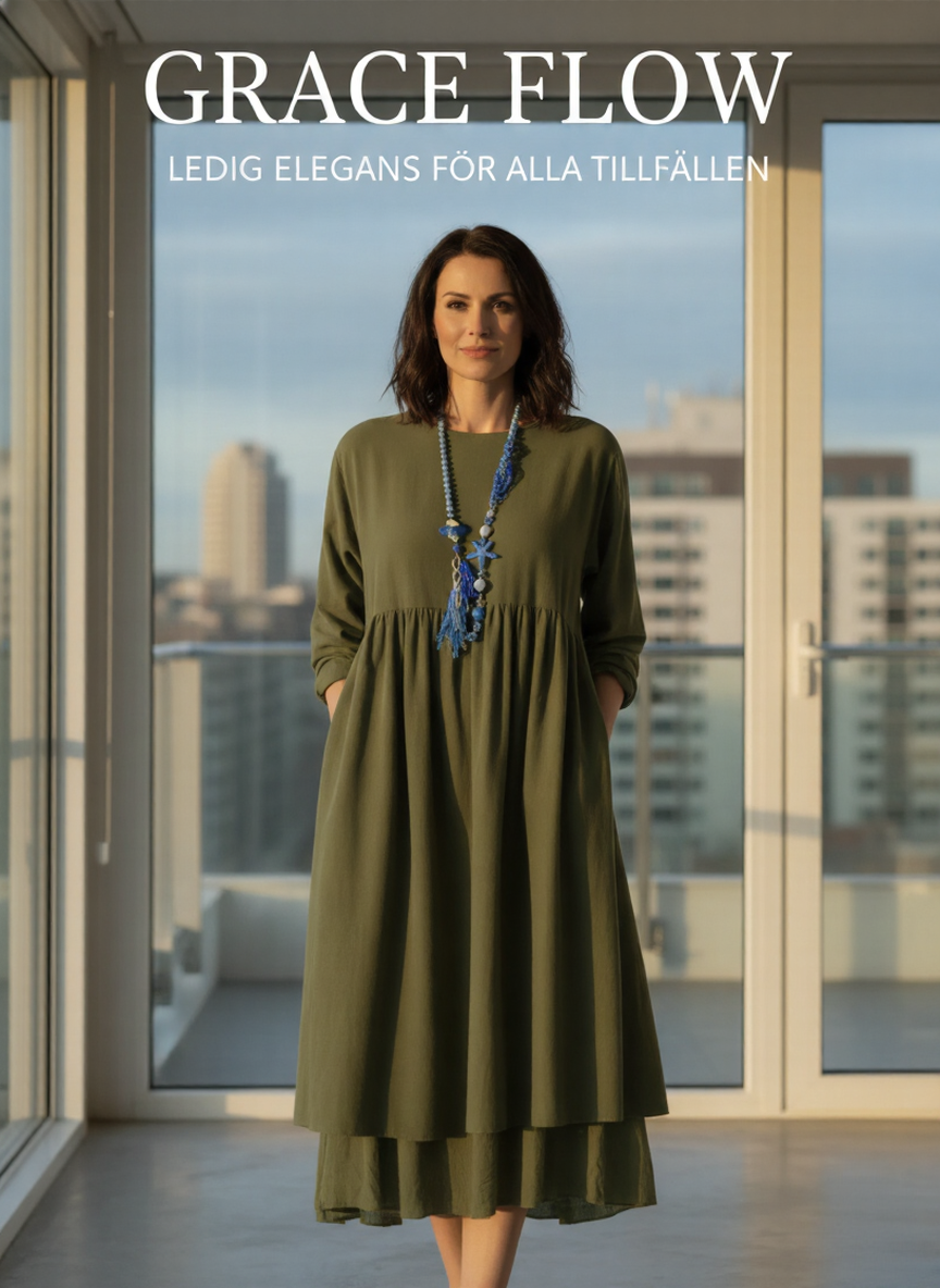 Tillverkad från mjuk blandning av bomull som andas och rör sig med kroppen, denna klänning är designad för kvinnor som vägrar att välja mellan komfort och stil. De droppade axlarna och långärmarna ger en soft, romantisk känsla, medan den A-formade siluetten och de vackra volangerna smekar varje kroppsform och skapar en harmonisk, elegant silhuett.