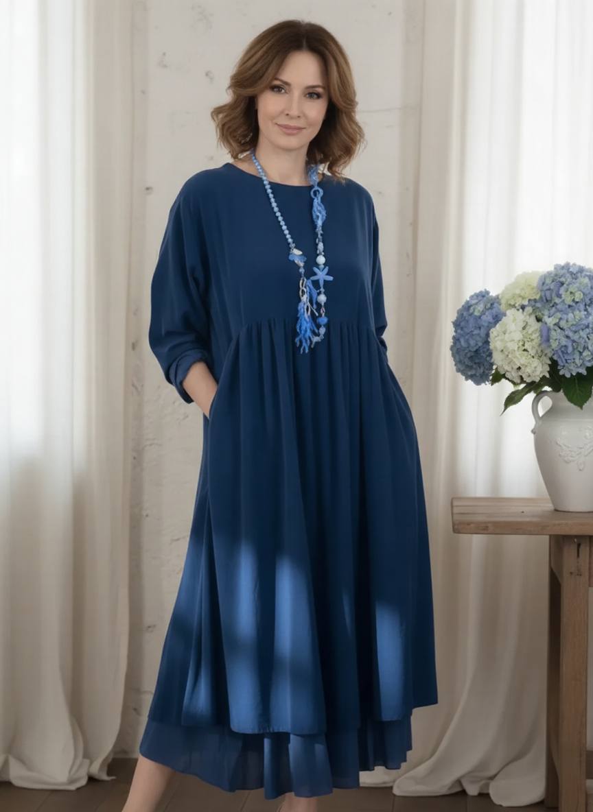 Färgen marineblå är en klassiker som passar till allt – från vita sneakers och denim-jacka på vardagarna till enkla smycken och balettflatlies för en mer raffinerad look. Den långa midi-längden ger dig en touch av sofistikering utan att kännas för formell.