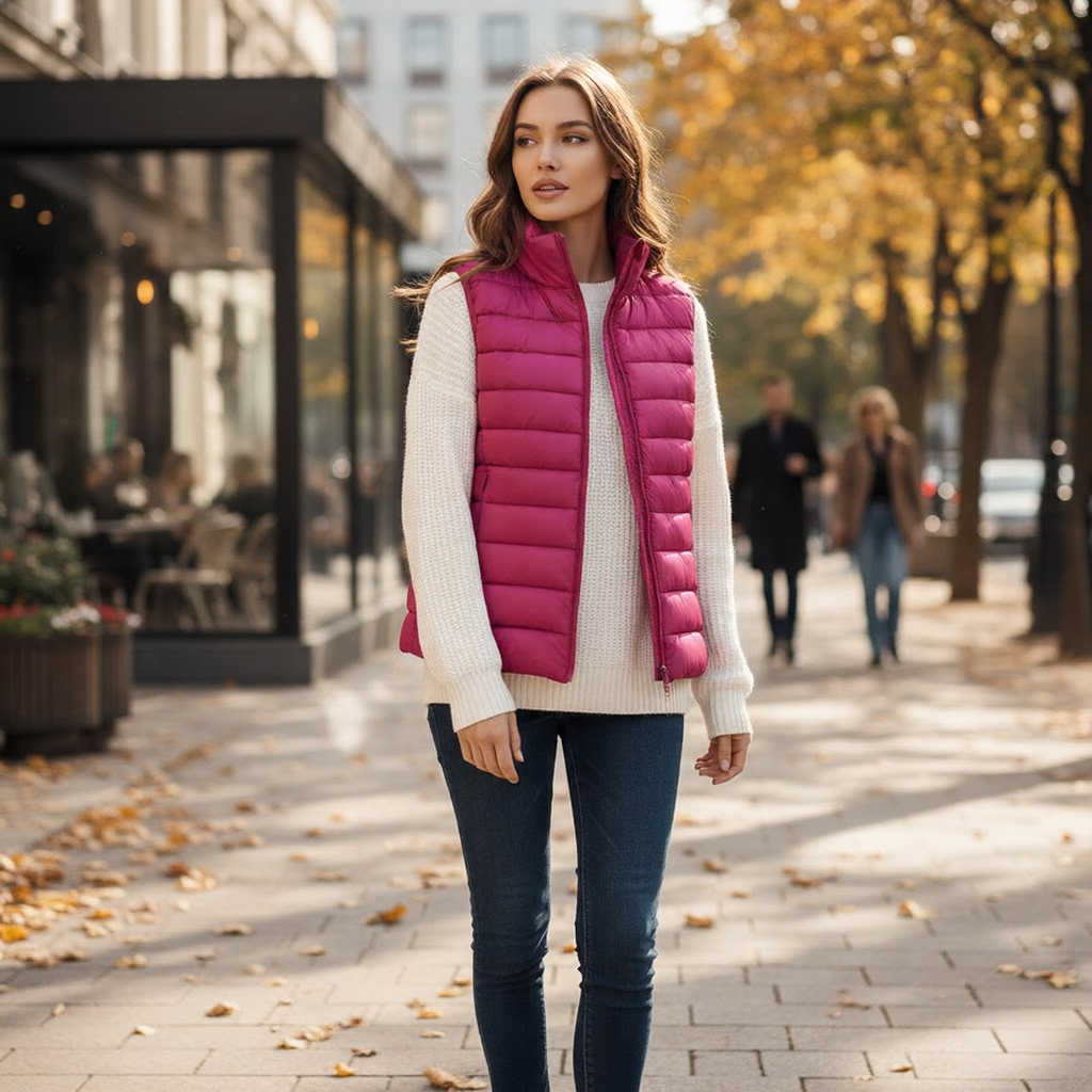 Denna lätt vadderade dunväst erbjuder behaglig värme utan den tunga jackans tyngd. Mjuk quiltning anpassar sig naturligt efter din kropp och ger en snygg, stilfull siluett. Smidig dragkedja fram gör påklädningen enkel, medan den höga kragen skyddar halsen mot sval vind.